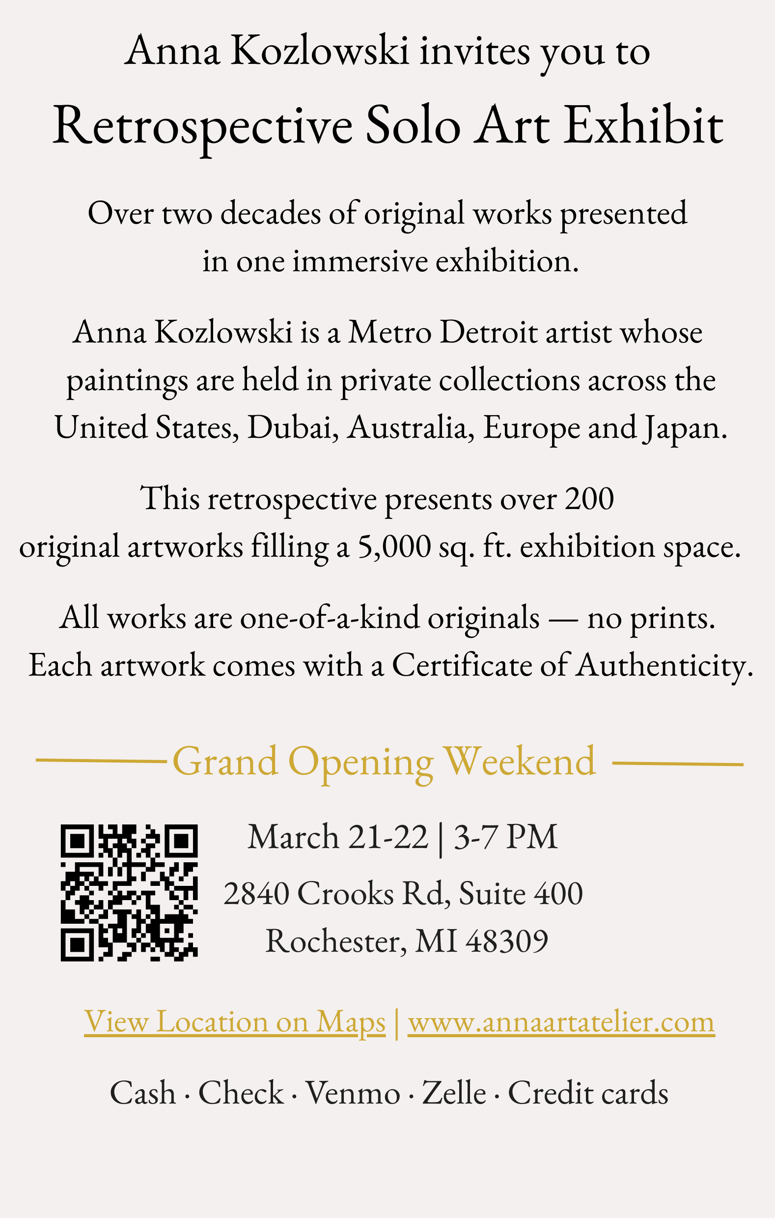 Anna Kozlowski is an internationally known artist with over 200 original paintings sold across four continents. Her unique style - developed over the past twenty years - combines paints, various textures, glazes, waxes, and top coats which imbue each painting with its own day-to-night cycle. As light hits the various waxes and metallic glazes, the paintings seem to be in a state of perpetual change, always shifting with their environment.